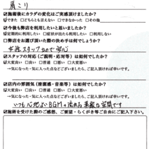「店内が清潔で、そして院長がいつも明るくお元気で、こちらにとって居心地良い雰囲気を作って下さっています。それは徹底した清掃と院長ご自身の体調管理の結果の表れであり、そこから強いプロ意識が伺え、「このお店、院長なら大丈夫。」と安心して体を任せられます。お二方の熱意は充分に患者さまに届いておりますよ。